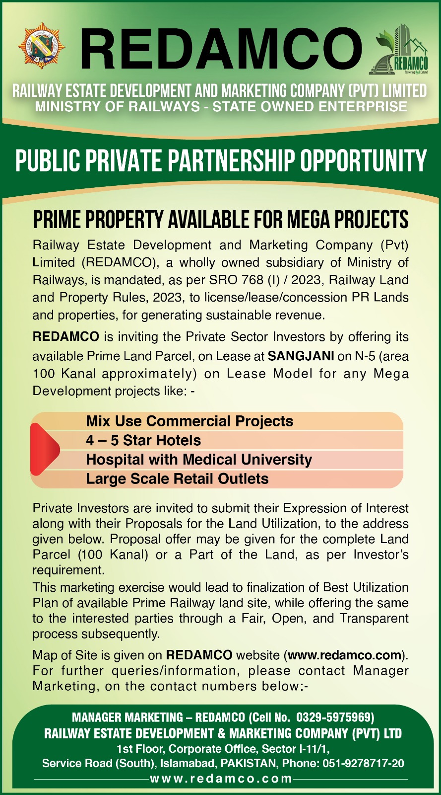 REDAMCO (Railway Estate Development and Marketing Company Pvt Ltd), state owned company under the Ministry of Railways, offers unique Public-Private Partnership business opportunities to transform Pakistan Railways' government-owned Prime Lands into high-value Commercial projects. With flexible business models like Joint Ventures, Revenue Sharing and REITs, we focus on developments such as branded hotels, retail spaces, shopping malls, corporate offices and more